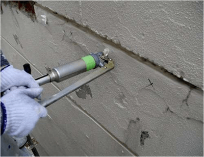 モルタルやコンクリート壁で見られる壁内部まで達しているような大きなひび割れでは、雨水の侵入により壁内部の木部・鉄などを腐食させてしまいます。ひび割れの状態に応じた最適な補修を行い、建物の防水性を高めます。